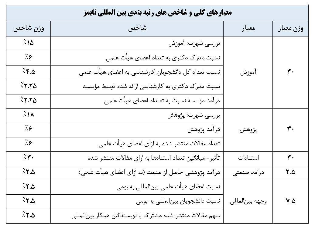 پایگاه رتبه بندی تایمز یکی از نظام های معتبر بین المللی است که از سال 2004 مراکز آموزش عالی را در سرتاسر جهان مورد ارزیابی و رتبه بندی قرار داده است. این رتبه بندی از 13 شاخص به شرح جدول زیر در قالب 5 معیار کلی: آموزش با وزن 30 درصد، پژوهش با وزن 30 درصد، استنادات با وزن 30 درصد، وجهه بین المللی با وزن 7.5 درصد و ارتباط با صنعت با وزن 2.5 درصد بهره گرفته است.